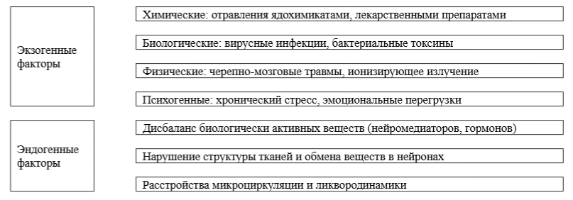Причины нарушений высшей нервной деятельности делятся на первичные (врожденные аномалии развития) и вторичные – экзогенные и эндогенные.